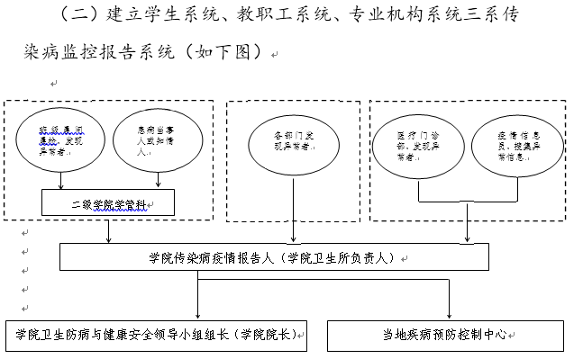 学院建立学生系统、教职工系统、专业机构系统三系传染病监控报告系统。建立由学生到教师、到学院疫情报告人、到学院领导的传染病疫情发现、信息登记与报告制度。