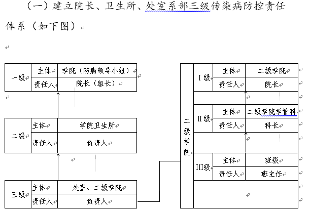 各二级学院院长对学生传染病报告工作负责;各处室、二级学院负责人对教职员工传染病报告工作负责;卫生所负责人对医疗门诊传染病报告工作负责。