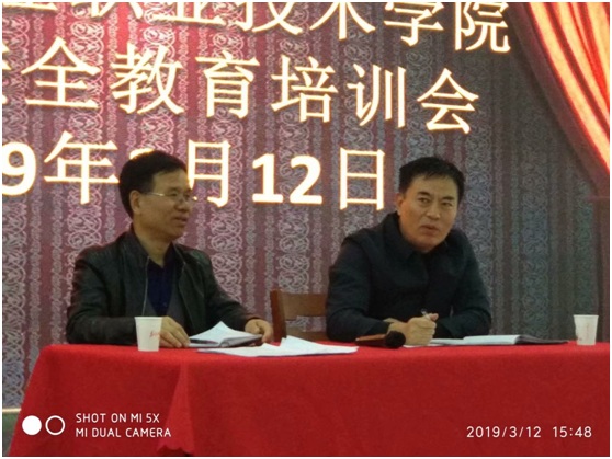 3月12日下午,总务处在教职工餐厅组织召开了食品安全教育培训会议,主管院领导于新和副院长、总务处处长郭宝东、各食堂管理员及所有餐饮从业人员参加了培训会,会议由郭宝东主持。