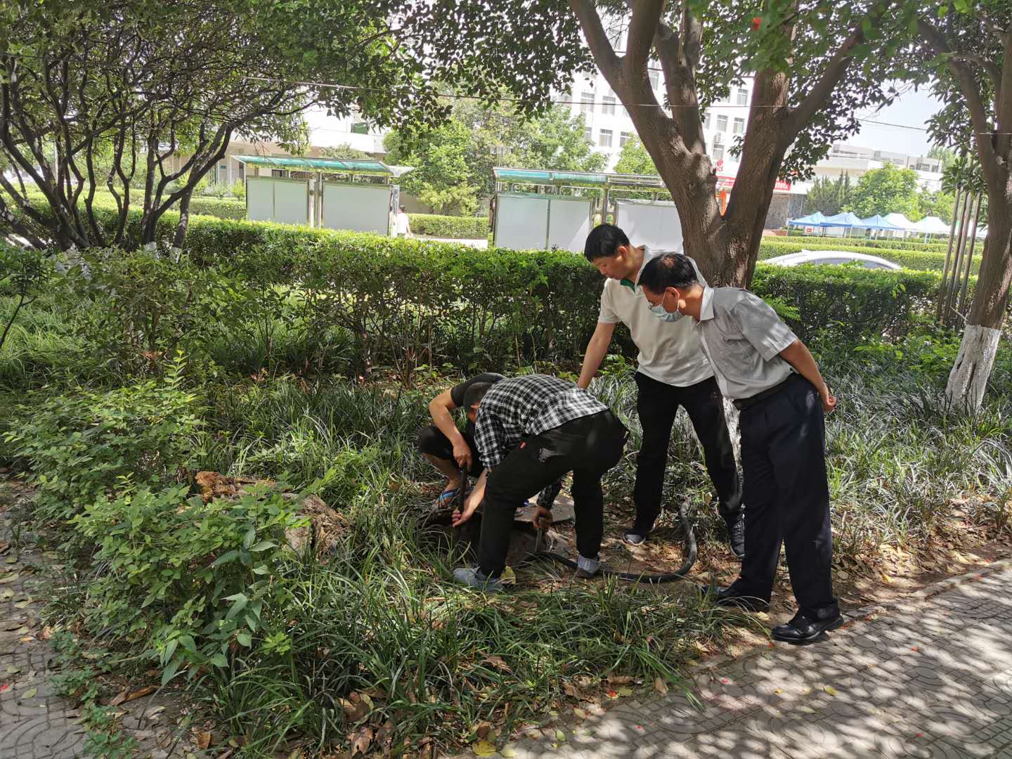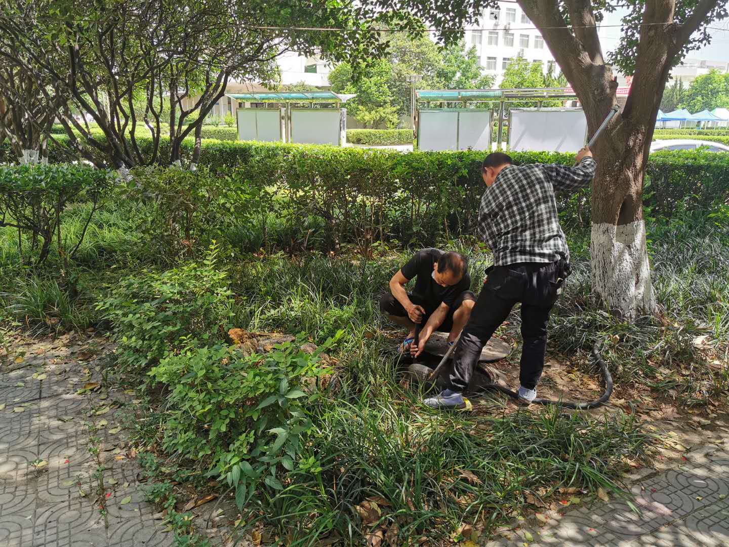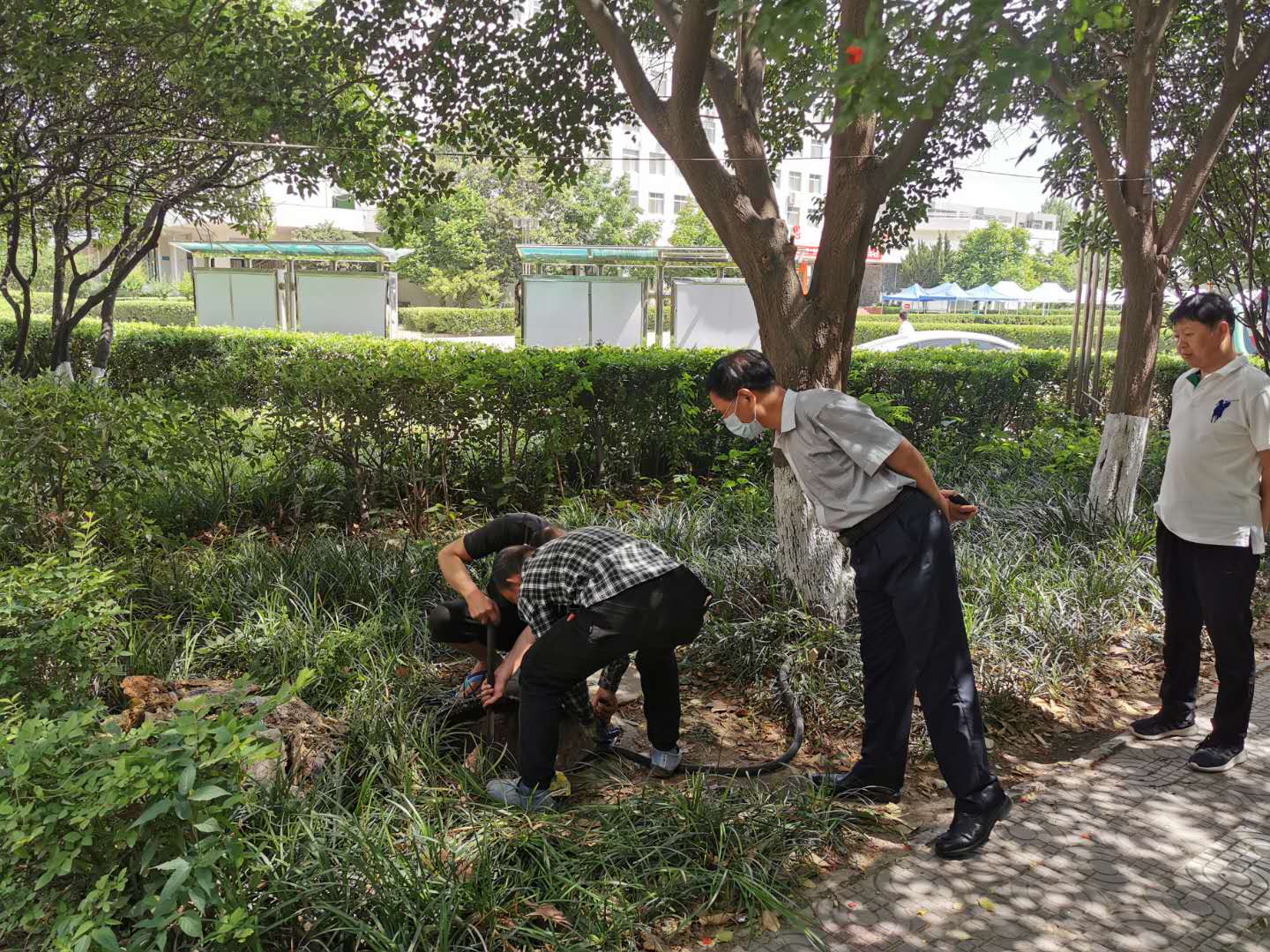5月23日,总务处动力部门员工对学院大门西侧门诊部旁排污井及排污管道进行例行检查清理。