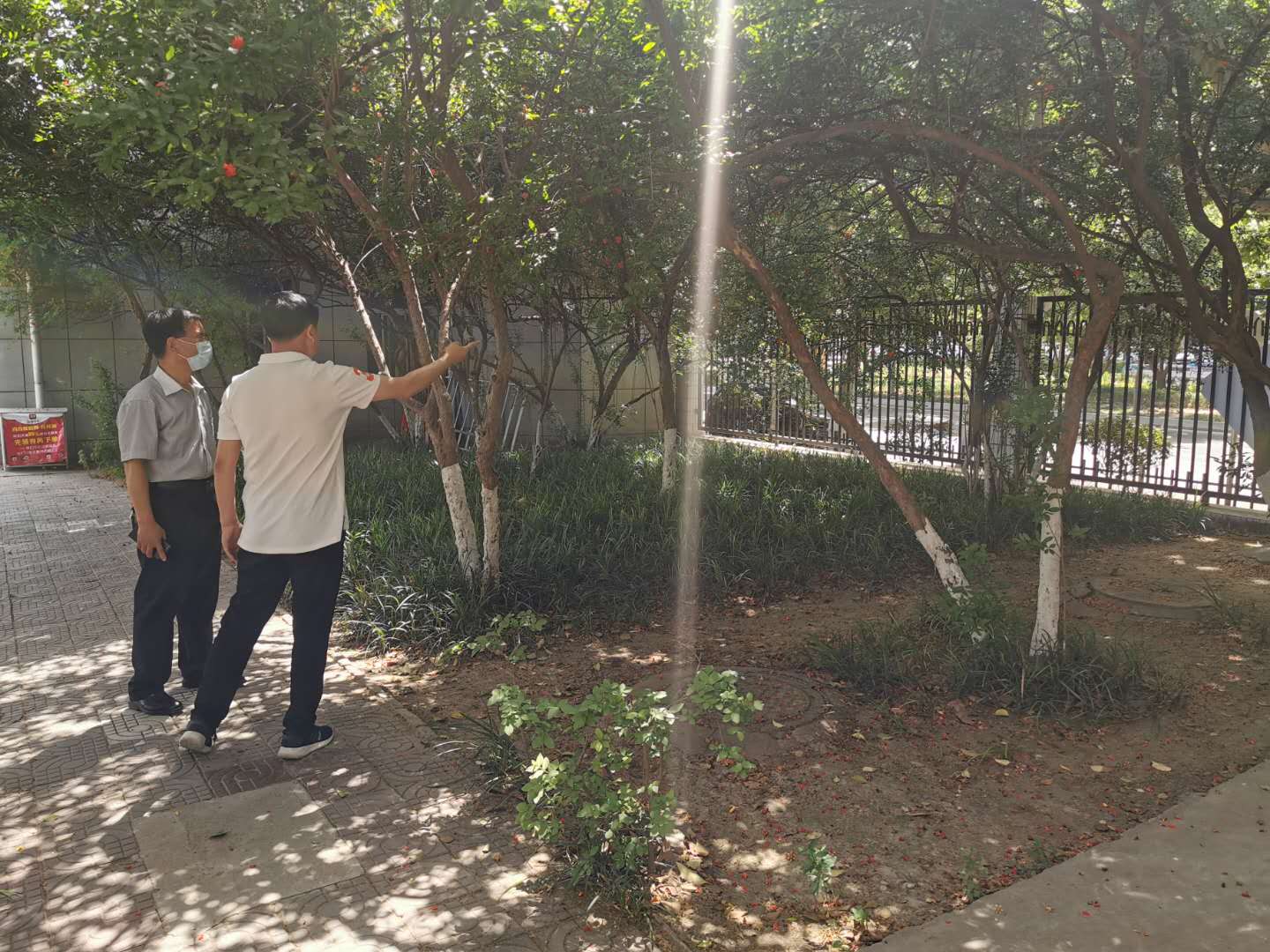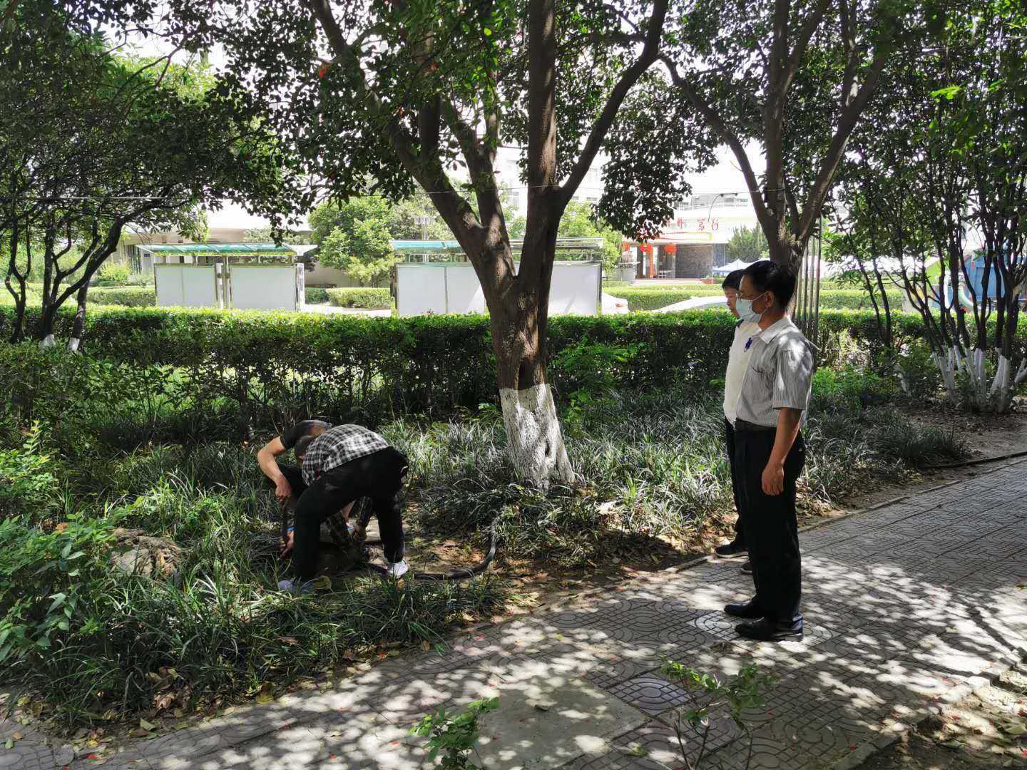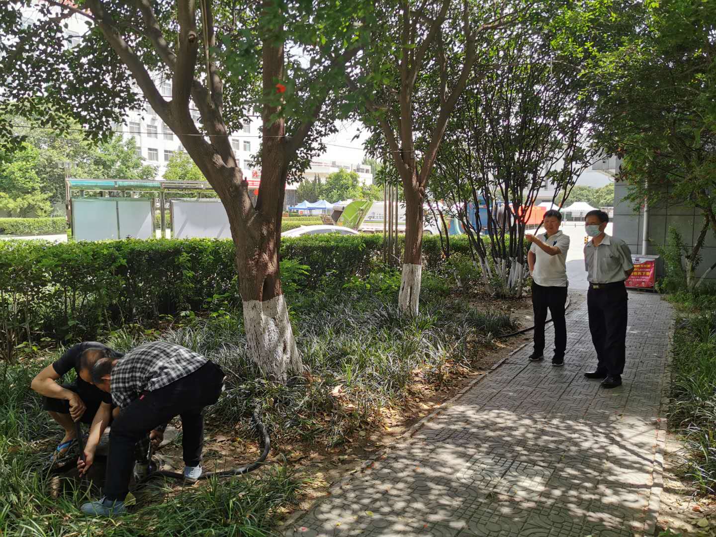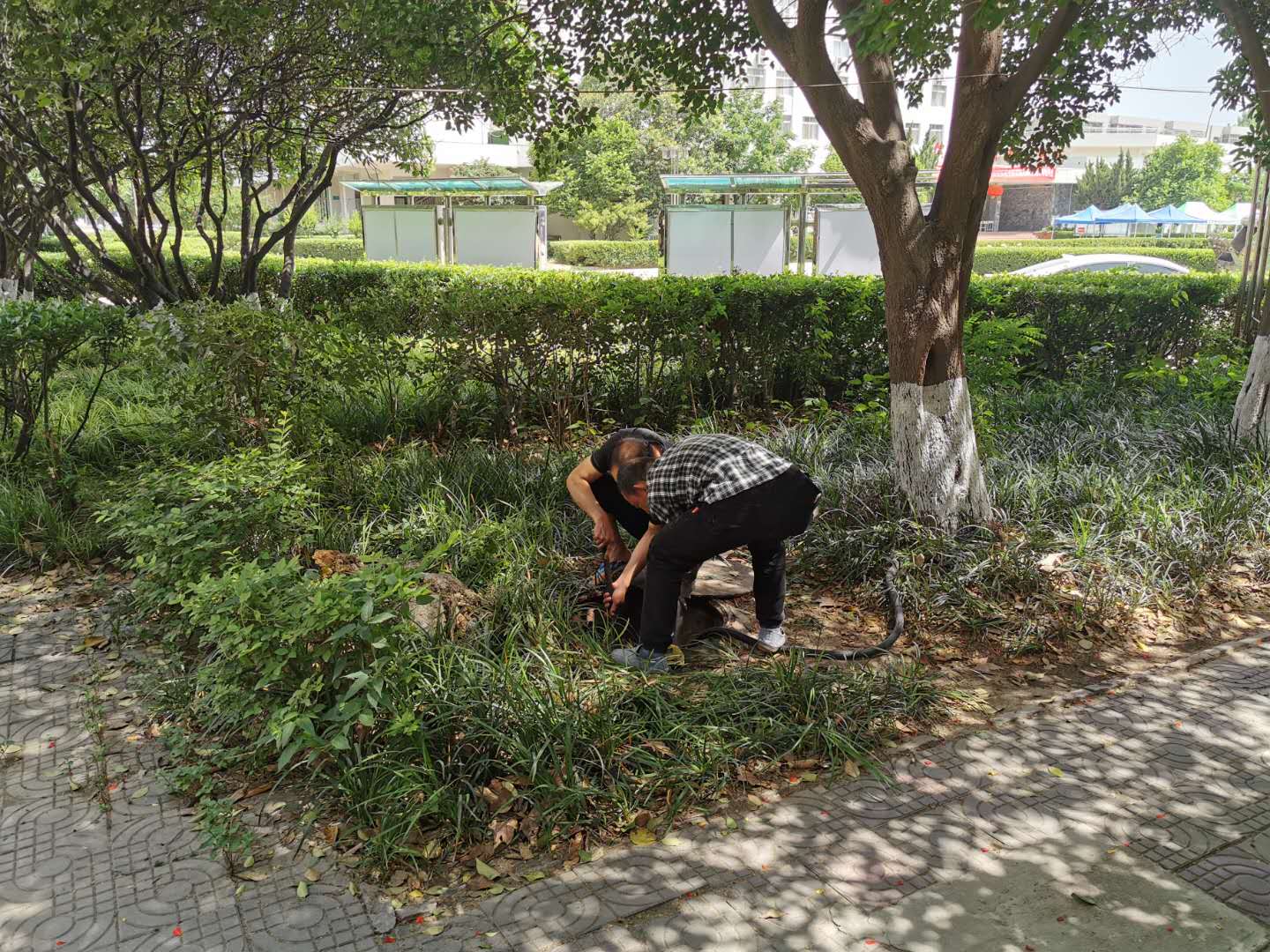 5月23日,总务处动力部门员工对学院大门西侧门诊部旁排污井及排污管道进行例行检查清理。