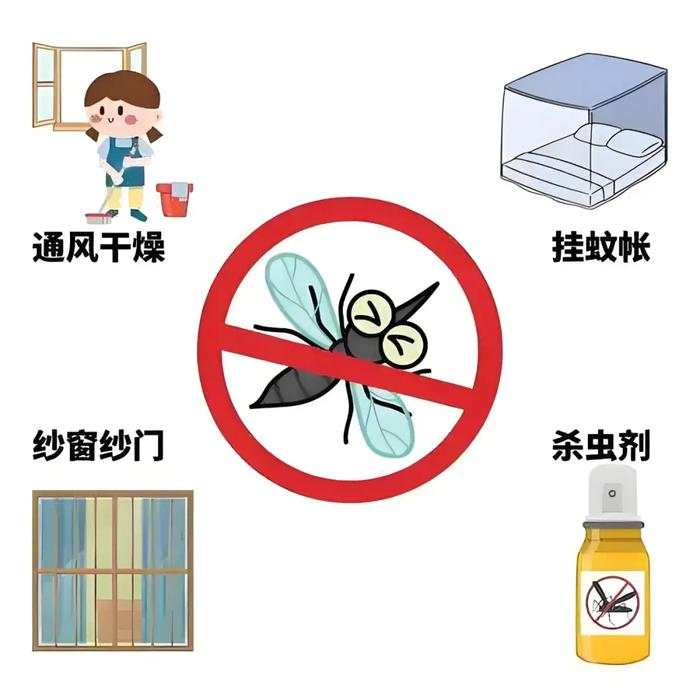 · 防蚊灭蚊:安装纱门纱窗、使用蚊帐蚊香;外出穿着浅色长袖衣裤,喷涂蚊虫驱避剂;定期清除房前屋后积水,消灭蚊虫孳生地。