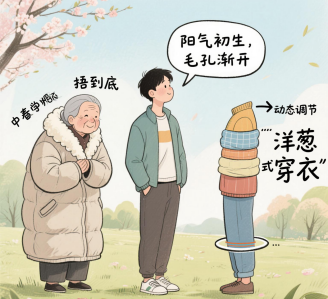 从中医角度看,春季阳气初生,人体毛孔逐渐开放,但外界寒气未散,过早减衣易让寒邪侵入。然而,不少长辈却误以为“捂到底”才安全,气温骤升时仍穿厚重衣物,结果反而可能导致出汗受凉、血压波动,甚至诱发心脑血管意外。科学对策:动态调节比“春捂秋冻”更科学,采用“洋葱式穿衣”,灵活调整。早晚温差大时,多层穿搭方便随时增减;出汗后及时擦干,避免冷风直吹;重点保护颈部、腰腹和脚踝,减少寒气入侵。