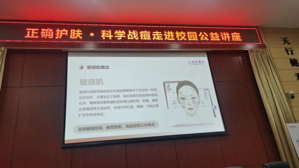 在秦黄蕾主任重点介绍了青春期痤疮的防治、洁肤、护肤、防晒等常见护肤误区和正确的护肤方法。通过分享典型临床案例重点讲解了同学们普遍关注的痤疮皮肤病,内容丰富多彩,贴近生活,PPT图文并茂,给同学们带来了一场实用、受益匪浅的护肤科普讲座,受到同学们的一致好评。讲座的最后,黄主任还针对同学们面临的皮肤问题与困扰进行了现场答疑解惑并提出了合理化的建议。