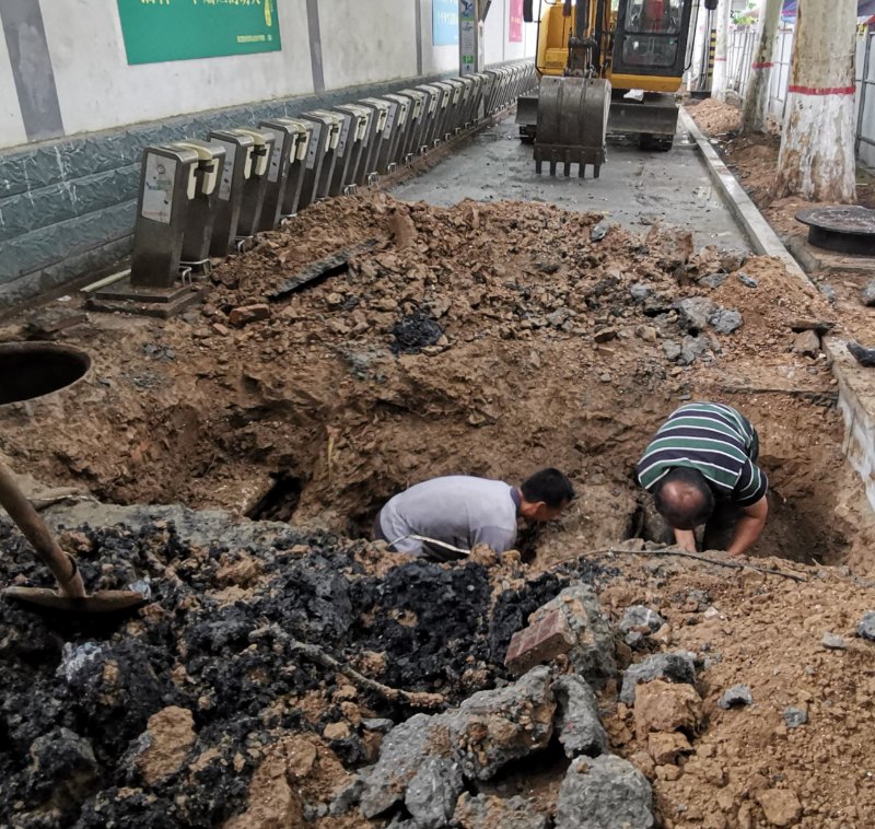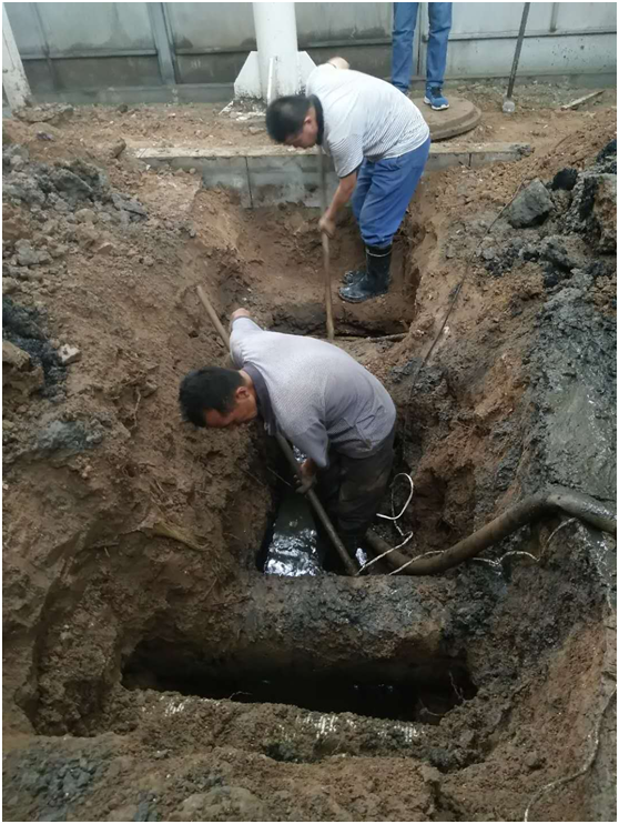 午饭后,天虽然下着雨,但水暖工陆季忠、王平安、张争利、安二定等同志,冒着雨进行开挖作业,污泥溅到了身上,臭味扑鼻而来,但大家无人退缩,干劲实足,下午5点多钟,已开挖到底,疏通了下水,排除了学院东区下水溢满的险情。因我院南墙外人行道下方排水管在市政东西走向管网的下方,维修施工难度较大,预计20日晚间可完成抢修工作。