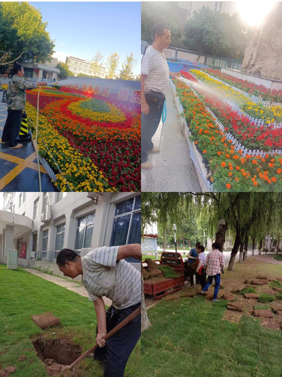 假期持续高温,校园绿化树木花草受到干旱的考验。为确保校园花草树木顺利过夏,综合科绿化管理人员高度重视绿化养护,对校园内的草坪、花草和树木进行隔日整体浇灌,每周一次修剪、清除杂草、杀菌防虫等工作。